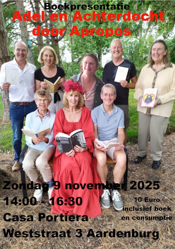 Ons schrijverscollectief Apropos bestaat vier jaar. Wij schreven een spannende who-dunnit, een leuk boekje ook om cadeau te geven met de feestdagen. Wij presenteren dit op 9 november. Entree E 10 inclusief boek en consumptie.