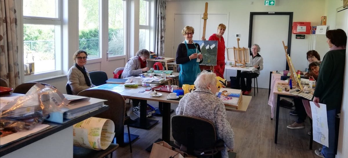 enthousiaste schildersclub in het dorpshuis van Waterlandkerkje