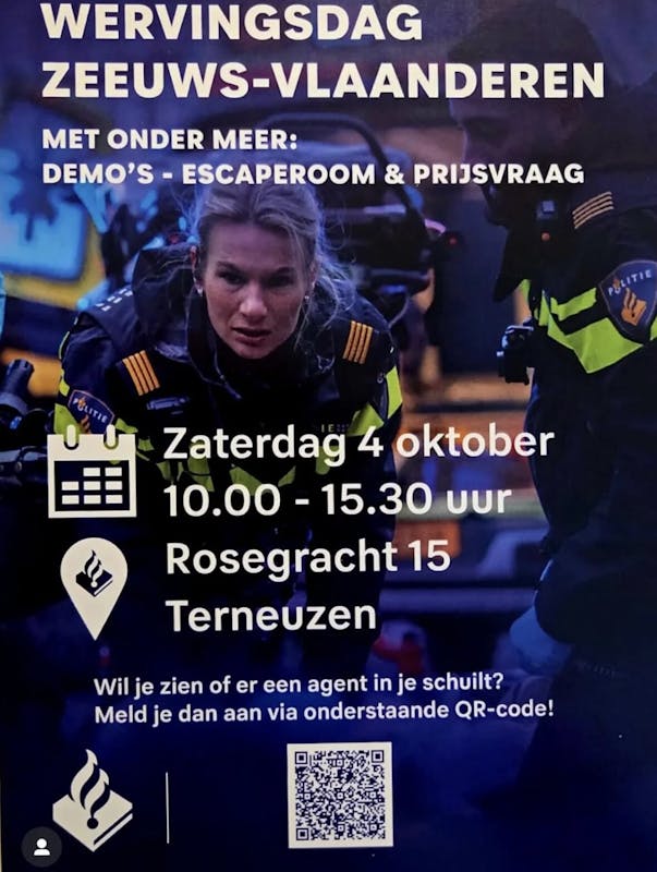 Kom dan aanstaande zaterdag in Terneuzen naar de wervingsdag Zeeuws-Vlaanderen van de politie. Wie weet help jij straks om Zeeuws-Vlaanderen veiliger te maken.