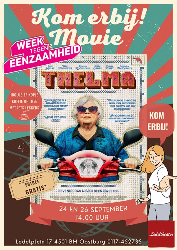 Van 26 september tot en met 2 oktober is het de week tegen eenzaamheid. In deze week staan ontmoeting en verbinding centraal. In samenwerking met JOTA Oostburg en het Ledeltheater wordt een Senior movie omgetoverd naar de 'Kom Erbij movie' op dinsdag 24 en donderdag 26 september 2024.